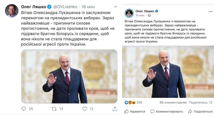 11:18 Лидер Радикальной партии Украины Олег Ляшко раньше чем Путин и Си Цзиньпин поздравил Лукашенко с победой на выборах. Правда, затем удалил оба поста. Любовь радикалов она такая непостоянная, - сообщает "Политика Страны" в Telegram.