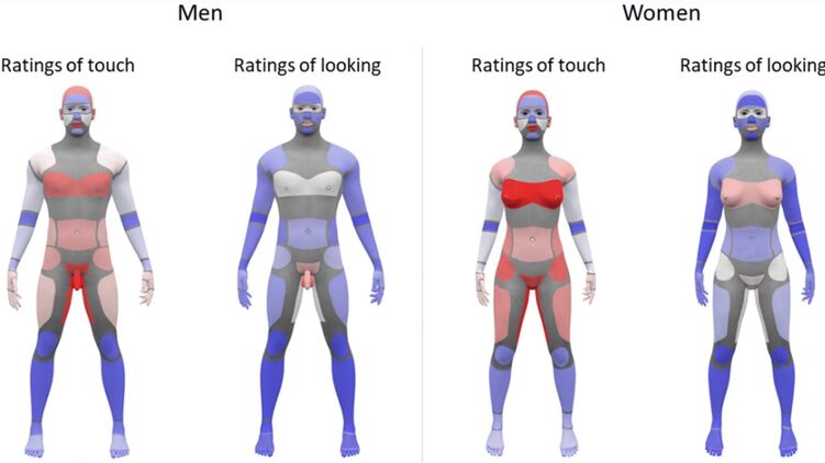 Красным отмечены участки тела, прикосновение к которым вызывает большее возбуждение у прикасающегося (смотрящего), чем у его партнера, синим - наоборот. Белые зоны одинаково возбуждают обоих