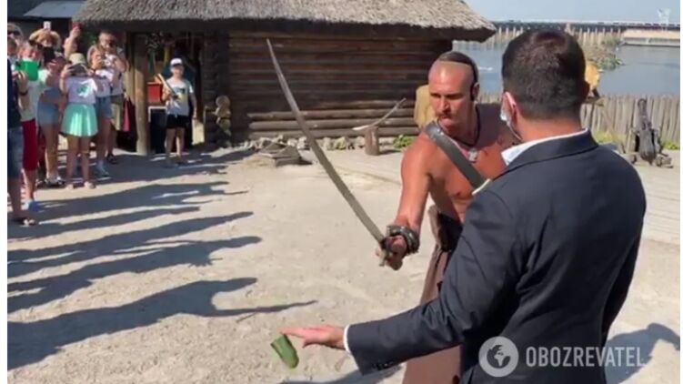На Хортице казак саблей разрубил огурец на ладони у Зеленского. Видео