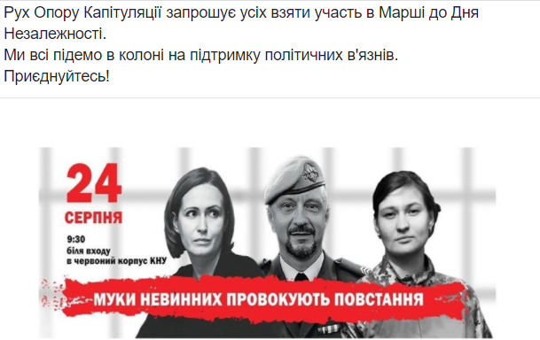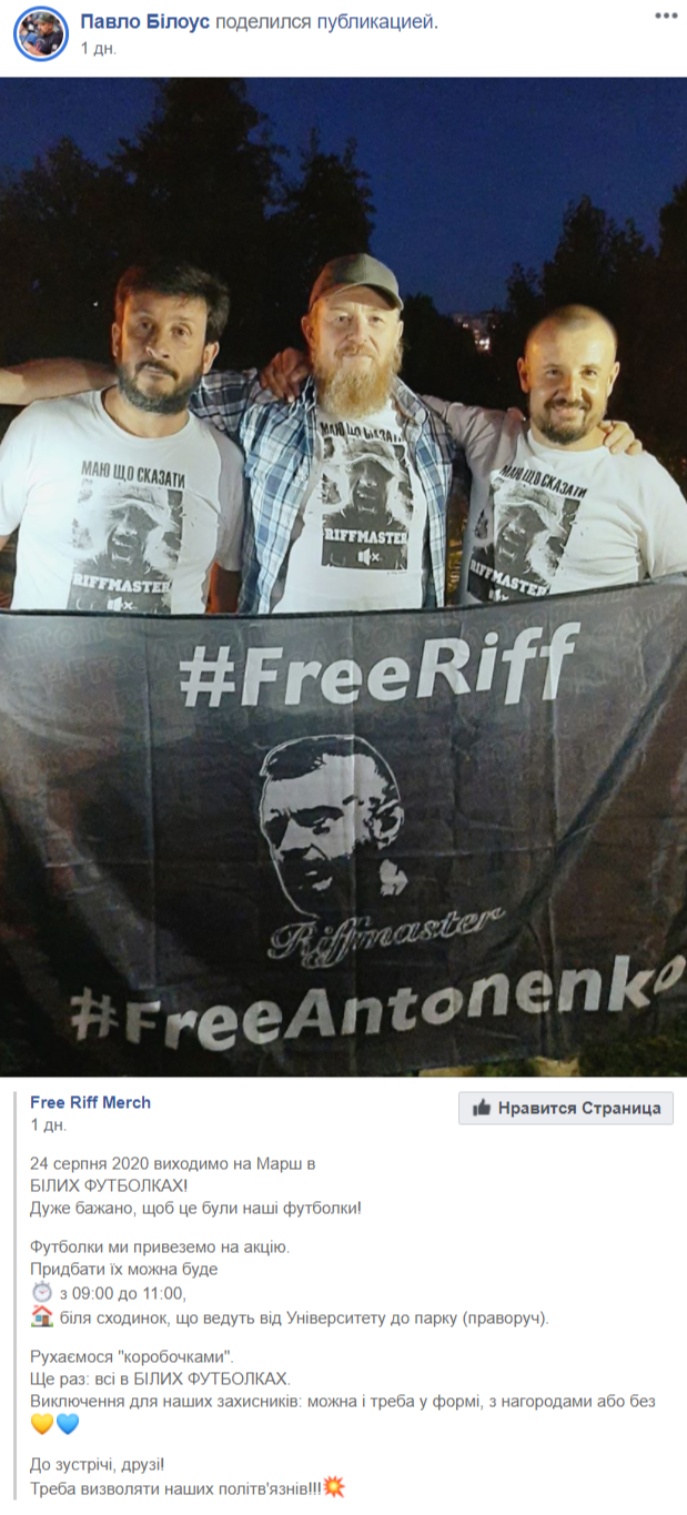 Близкий к Порошенко "Рух опору капитуляции" призывает сторонников выходить на марш 24 августа в белых футболках #FreeRiff #FreeAntonenko (подозреваемые в убийстве журналиста Павла Шеремета, - Ред.), которые собираются раздавать в парке Шевченко перед маршем.