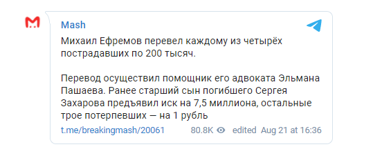 "Михаил Ефремов перевел каждому из четырех пострадавших по 200 тысяч. Перевод осуществил помощник его адвоката Эльмана Пашаева. Ранее старший сын погибшего Сергея Захарова предъявил иск на 7,5 миллионов, остальные трое потерпевших - на 1 рубль", - говорится в сообщении.