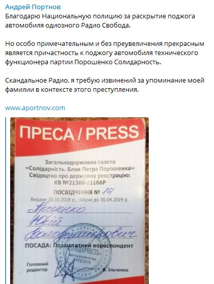 Юрист Андрей Портнов в телеграм-канале написал, что к поджогу причастен технический функционер партии Петра Порошенко "Солидарность" и обнародовал фото журналистского удостоверения на имя Юрия Проценко.