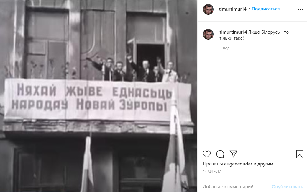 Один из руководителей "Муниципальной варты" Киева Сергей Бондарь разместил у себя в Инстаграм фото Беларуси времен нацистской оккупации. Он снабдил их комментариями "За европейскую Беларусь!" и "Если Беларусь - то только такая".