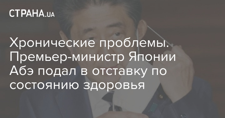 Премьер-министр Японии Синдзо Абэ после восьмилетнего нахождения в должности подал в отставку по состоянию здоровья. В сделанном по этому поводу официальном сообщении говорится, что он страдает хронической болезнью и беспокоится, что ее обострение будет мешать работе премьера. Об этом сообщает NHK.
