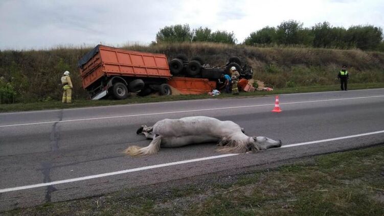 После столкновения с лошадью в Курской области перевернулся КаМАЗ, а его водитель скончался.