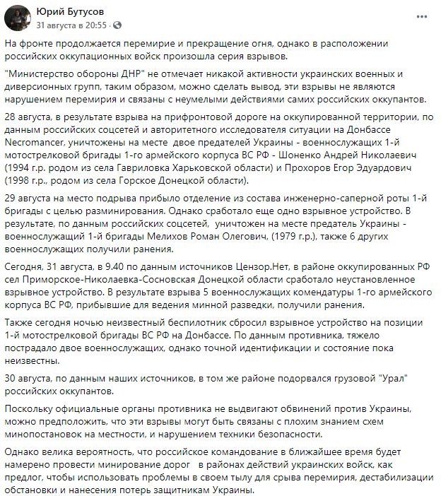 Бутусов со ссылкой на свои источники сообщил о том, что 28 августа на оккупированной территории были взорваны два военнослужащих сепаратистов, потом подорвались еще и саперы, прибывшие на место.