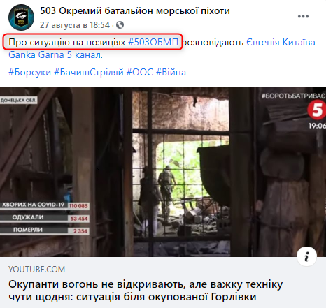 За два дня до ультиматума Пушилина "5 канал" сделал сюжет из жизни пехотинцев 503-го ОБМП. В сюжете это войсковое соединение не называется, но его перепостил на своей странице в Фейсбуке сам батальон.