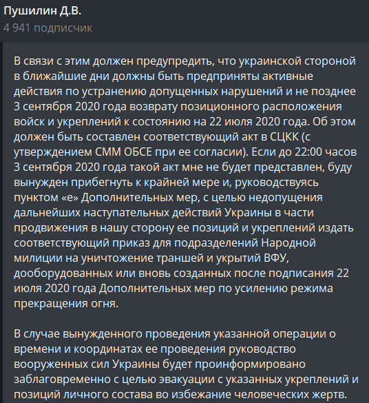 После чего он поставил ультиматум - до 3 сентября траншеи ликвидировать и вернуться на исходные позиции, иначе по ним будет открыт огонь.