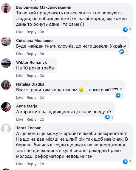 "Правительство пусть поцелует народ в .... Карантинить заставляют - а компенсации где?" - вопрошает Галя Дзюбинская.