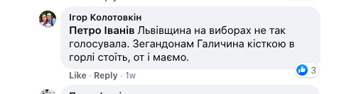 "Львовщина на выборах не так голосовала. "Зег@ндонам" Галичина костью в горле стоит, вот и имеем", - возмущается львовянин Игорь Колотовкин.