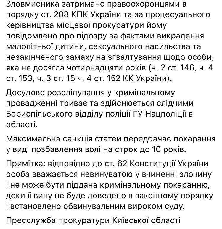 29-летний мужчина задержан правоохранителями в порядке ст. 208 УПК Украины и за процессуального руководства местной прокуратуры. Ему сообщили о подозрении по фактам похищения малолетнего ребенка, сексуального насилия и неоконченного покушения на изнасилование в отношении лица, не достигшего четырнадцати лет (ч. 2 ст. 146, ч. 4 ст. 153, ч . 3 ст. 15 ч. 4 ст. 152 УК Украины). Как сообщается, он может сесть в тюрьму на десять лет.