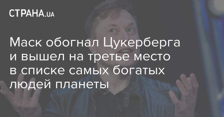 Основатель компаний Tesla и SpaceX Илон Маск покинул четвертое и вышел на третье место в списке самых богатых людей мира. Он опередил в списке основателя Facebook Марка Цукерберга, который опустился на четвертую строку рейтинга.