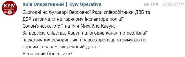 "Сегодня на бульваре Верховной Рады сотрудники ДВБ и ГБР задержали с поличным инспектора полиции Соломенского УП по имени Михаил Кавун. Неплохой бизнес, ага?", - пишут авторы публикации.