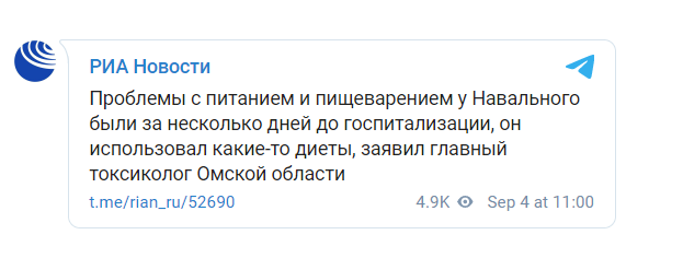 Также российские СМИ пишут, что, по словам токсиколога Александра Сабаева, диеты Навального были связаны с похудением. А проблемы с питанием и пищеварением возникли у оппозиционера за 5–7 дней до госпитализации.