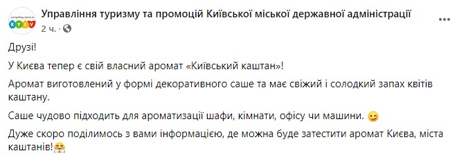 Как отмечается для гостей и туристов Киева создали специальный аромат "Киевский каштан". Сувенир изготовлен в форме декоративного саше. Он имеет свежий, сладковатый запах цветов каштана.