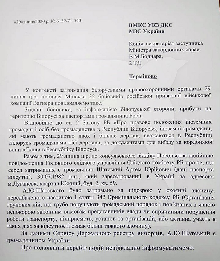 В документе говорится, что белорусские власти уже 29 июля уведомили консульство об одном из задержанных - Артеме Шатском, который прописан в Луганске.