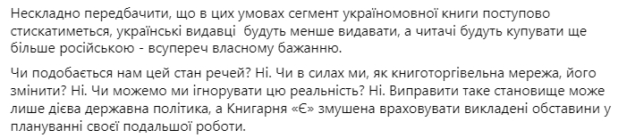 Сеть книжных магазинов Украины Книгарня "Є" заявила, что у русскоязычного продукта на украинском рынке больше шансов, поэтому она вынуждена приспосабливаться к условиям. Также они предположили, что сегмент украиноязычной книги постепенно будет сокращаться.