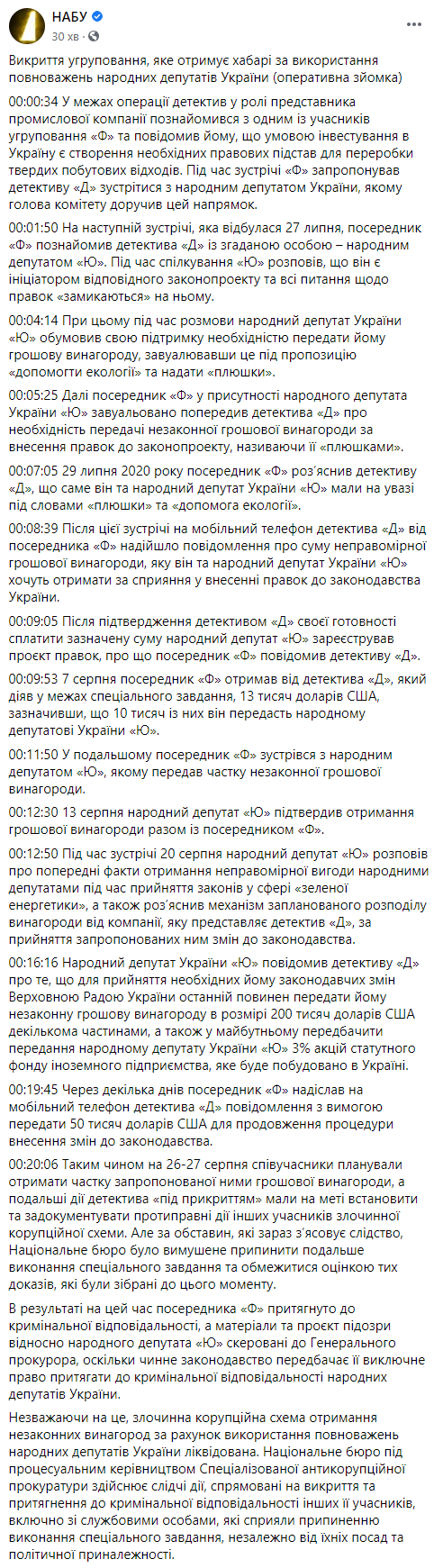 Сообщается, что НАБУ внедрило в состав группировки своего агента, который выступил в качестве представителя промышленной компании. Он познакомился с одним из участников преступного формирования. Детектив сообщил ему, что условием инвестирования в Украине является создание необходимых правовых оснований для переработки твердых бытовых отходов, с этой целью фигурант дела знакомит детектива с нардепом, которого ведомство именует "депутат Ю". Он в свою очередь попросил "помочь экологии" и дать "плюшки" - под этим депутат имел ввиду получение взятки в сумме $13 тыс. за внесение правок в законопроект и в дальнейшем еще $200 тыс. - для членов профильного комитета.