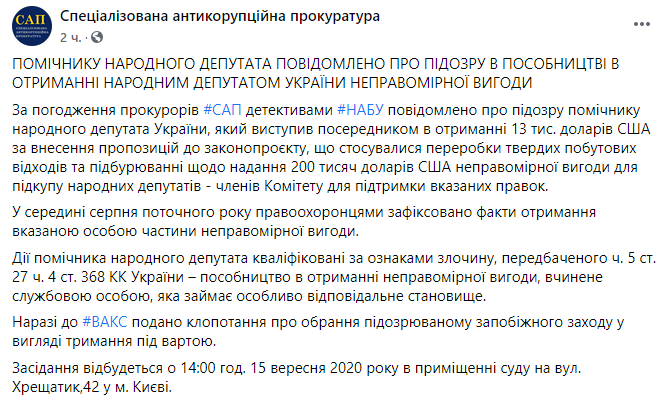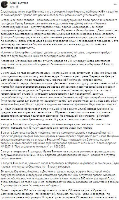 "Два дня назад НАБУ задержало на взятке помощника депутата Александра Юрченко, который взял первые 13 тысяч из 200 тысяч долларов, которые предусматривались нардепу Юрченко за законопроект, связанный с бытовыми отходами.