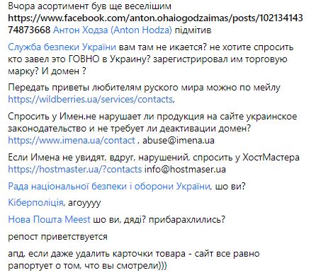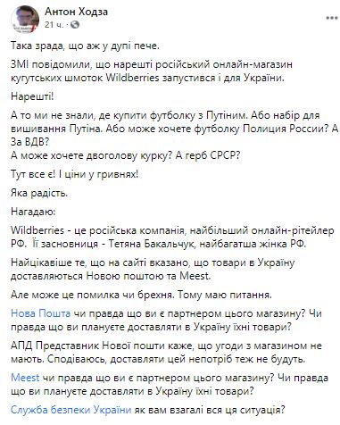"Такая зрада, что даже в заднице печет. СМИ сообщили, что наконец российский онлайн-магазин кугутських шмоток Wildberries запустился и для Украины. Наконец-то!