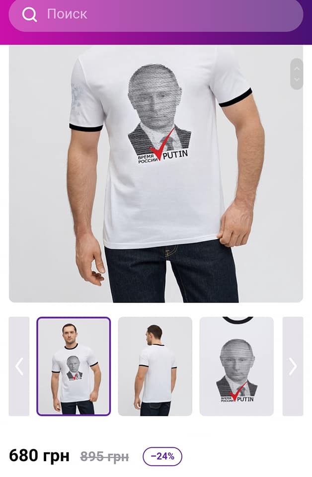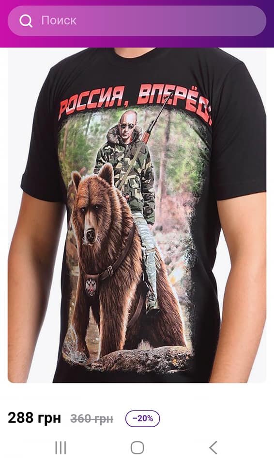 А то мы не знали, где купить футболку с Путиным. Или набор для вышивания Путина. Или, может, хотите футболку Полиция России? А За ВДВ? А, может, хотите двуглавую курицу? А герб СССР? Здесь все есть! И цены в гривнах! Какая радость", - написал блогер Антон Ходза.