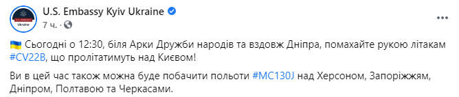 "Сегодня в 12:30 возле Арки Дружбы народов и вдоль Днепра, помашите рукой самолетам # CV22B, которые будут пролетать над Киевом!