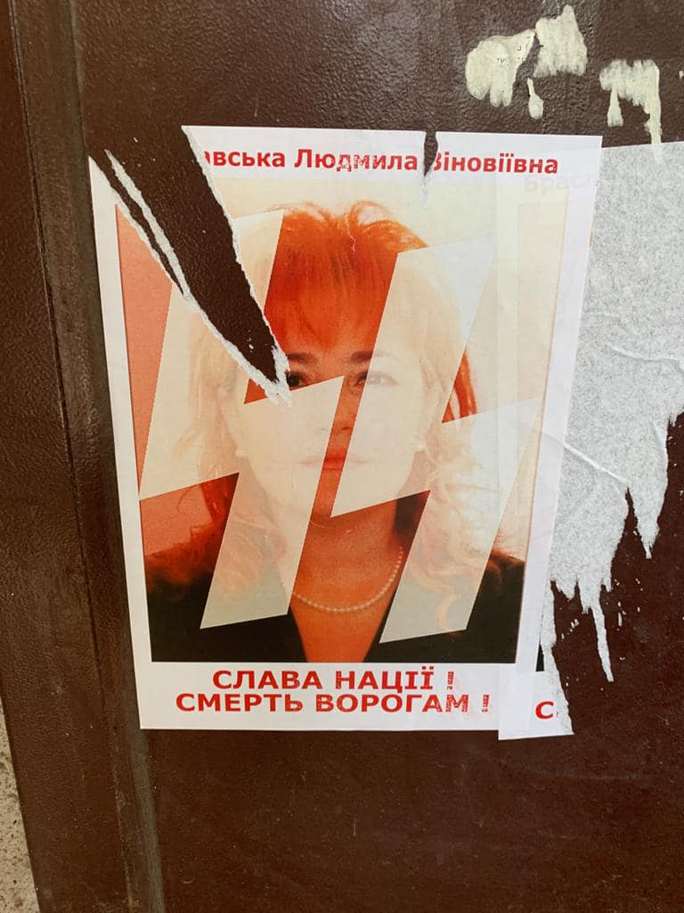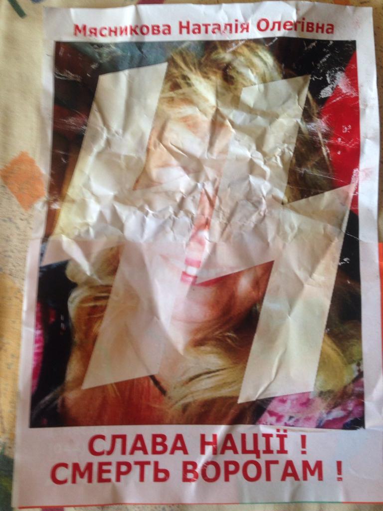 Дальше - больше. Ночью в подъезде и на двери истца Натальи Мясниковой развесили около 20 листовок с ее портретом, рунами СС и лозунгом "Слава нации, смерть врагам".