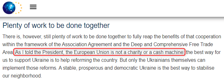 "Как я сказал президенту, Европейский Союз не благотворительная организация или банкомат. Лучший способ поддержать Украину для нас - это помочь в реформировании страны, но осуществить эти реформы могут только сами украинцы", - сказал Боррель. Причем его слова цитируются на сайте Евросоюза. Другими словами, это не частное заявление.