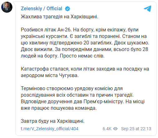 "Ужасная трагедия на Харьковщине. Разбился самолет Ан-26. На борту, кроме экипажа, были украинские курсанты. Есть погибшие и раненые. По состоянию на эту минуту подтверждено 20 погибших. Двух ищем. Двое выжили. По предварительным данным, всего было 28 человек на борту. Просто нет слов", - заявил Зеленский.