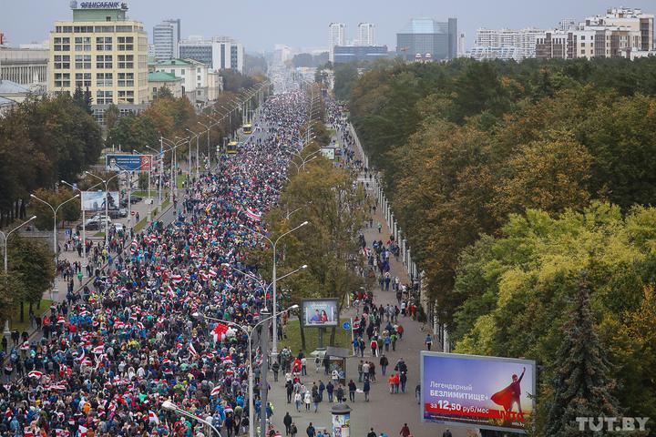 19:00 Колонна митингующих дошла до проспекта Независимости, 168, и решила расходиться. Скандируют: "Каждый день", "Молодцы", "Верым, можам, переможам".