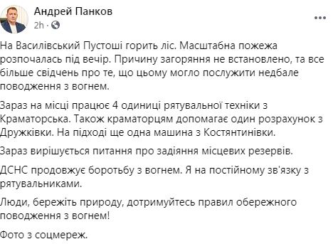"ДСНС продолжает борьбу с огнем. Я на постоянной связи со спасателями. Люди, берегите природу, соблюдайте правила осторожного обращения с огнем ", - рассказал мэр Краматорска.