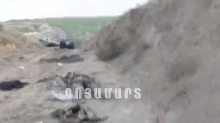 Кроме того, показаны тела азербайджанских солдат, которые лежат возле уничтоженной техники.