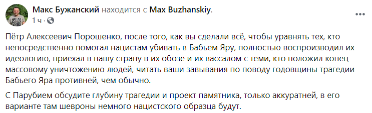 Нардеп от "Слуги народа" Макс Бужанский ответил на пост Петра Порошенко о Бабьем Яре. Он напомнил экс-президенту, что при его каденции власти реабилировали пособников нацистов из числа украинских националистов, которые участвовали в Холокосте.