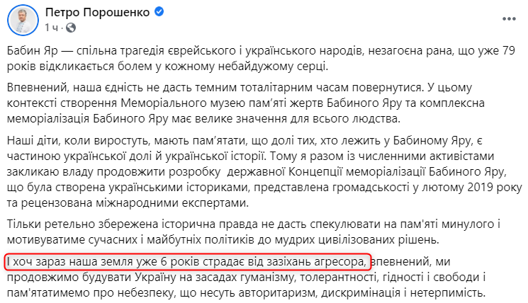 Экс-президент также забыл, что расстрелы в Бабьем Яре вела нацистская Германия. Зато в своем посте он прошелся по "агрессору", с которым Украина воюет сейчас.