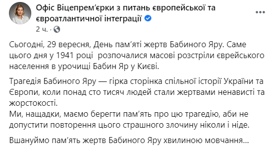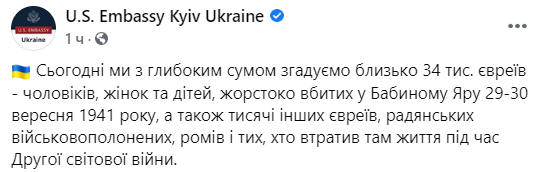 "Сегодня мы с глубокой скорбью вспоминаем около 34 тысяч евреев - мужчин, женщин и детей, жестоко убитых в Бабьем Яре 29-30 сентября 1941 года, а также тысячи других евреев, советских военнопленных, ромов и тех, кто потерял там жизни во время Второй мировой войны", - говорится в заявлении представительства.