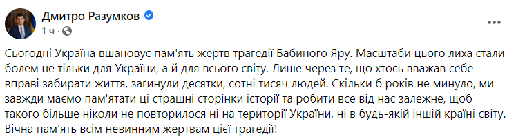 Спикер парламента Дмитрий Разумков в своем обращении в Фейсбуке пишет, что "кто-то считал себя вправе отнимать жизнь", но кто именно - не уточняет.