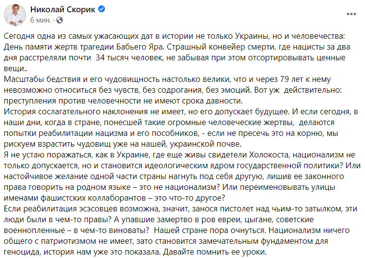 Нардеп от "Оппозиционной платформы", кандидат в мэры Одессы Николай Скорик не только упомянул о нацистах, но и напомнил, что их идейные последователи сегодня чувствуют себя вольготно в Украине. А это значит, что урок Бабьего Яра не усвоен, и трагедия может повториться.