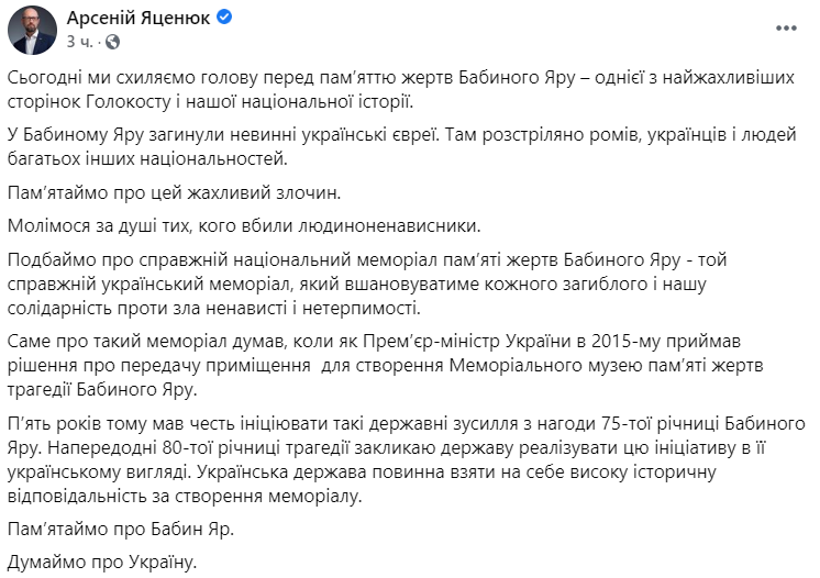 Экс-премьер Арсений Яценюк написал развернутый пост о Бабьем Яре и Холокосте, но также решил не упоминать, кто же все-таки его устроил и когда. Называя виновников трагедии максимально неконкретно - "человеконенавистники". .png)