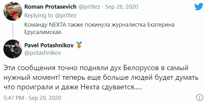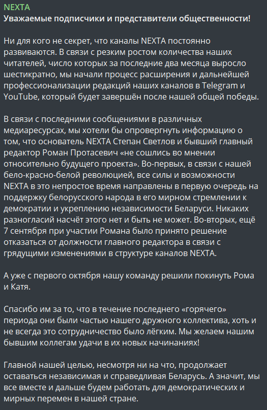 В связи с последними сообщениями в различных медиаресурсах, мы хотели бы опровергнуть информацию о том, что основатель NEXTA Степан Светлов и бывший главный редактор Роман Протасевич "не сошлись во мнении относительно будущего проекта". Во-первых, в связи с нашей бело-красно-белой революцией, все силы и возможности NEXTA в это непростое время направлены в первую очередь на поддержку белорусского народа в его мирном стремлении к демократии и укреплению независимости Беларуси. Никаких разногласий насчет этого нет и быть не может. Во-вторых, еще 7 сентября при участии Романа было принято решение отказаться от должности главного редактора в связи с грядущими изменениями в структуре каналов NEXTA.