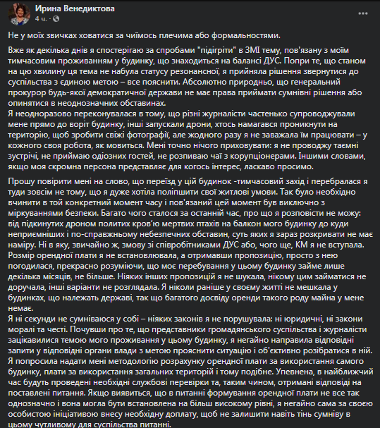 Напомним, Венедиктова заявила, что переехала в резиденцию президента в целях безопасности, намерена оплатить аренду и обещала скоро покинуть этот дом.