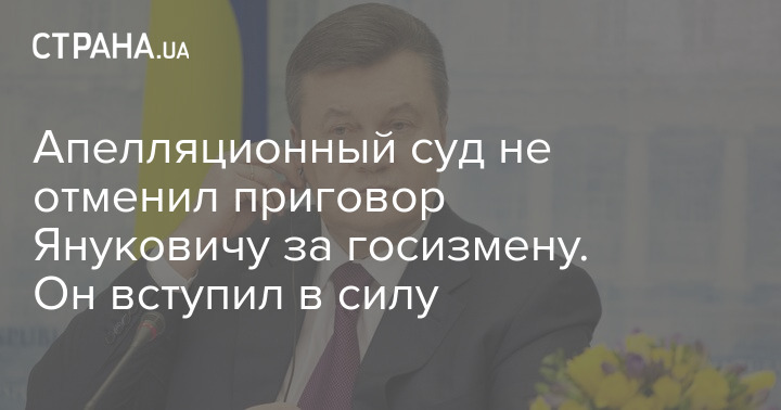 Коллегия судей Киевского апелляционного суда оставила в силе приговор Оболонского райсуда Киева, который заочно приговорил бывшего президента Украины Виктора Януковича к 13 годам лишения свободы за государственную измену. Таким образом приговор вступил в силу.