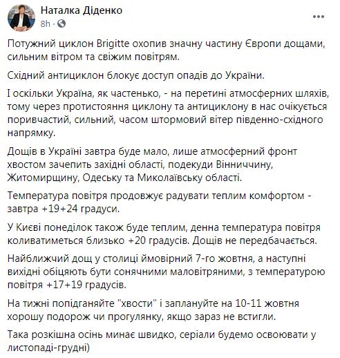 Об этом сообщила синоптик Наталья Диденко на своей странице в Фейсбуке.