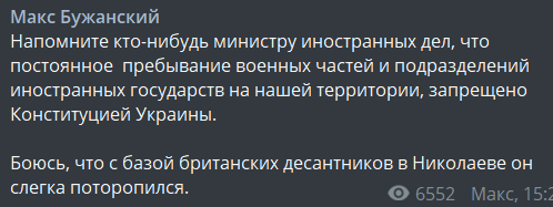 Боюсь, что с базой британских десантников в Николаеве он слегка поторопился", - пишет нардеп Макс Бужанский ("Слуга народа").