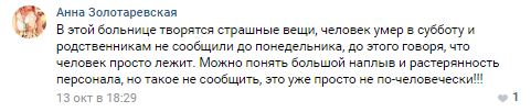 Кроме этого сотрудники больницы обсуждают ситуацию с трупами умерших от коронавируса, которые пролежали несколько дней. В соцсетях пишут, что в субботу в больнице умер человек и до понедельника его родным не сообщали об этом.