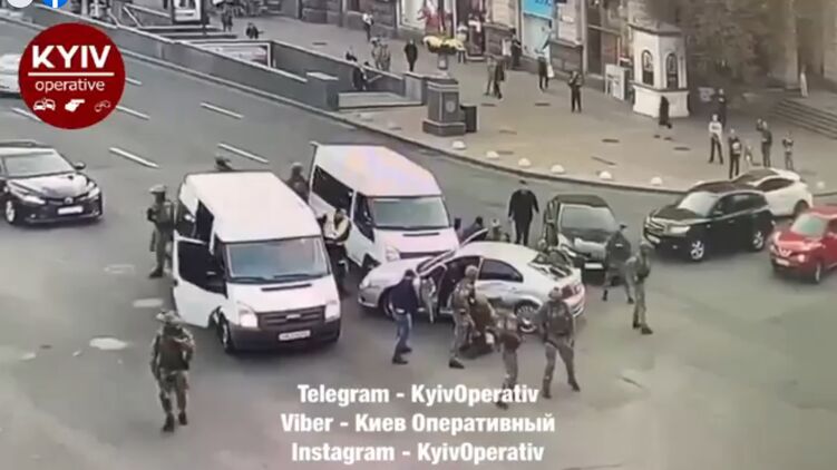 На кадрах видно, как легковушка бандитов мчится по Крещатику и пытается свернуть на улицу Прорезную, однако путь ей преграждает ряд других машин. Пока она старается развернуться, задевая окружающие автомобили, ее блокируют фургон силовиков и пешие спецназовцы.