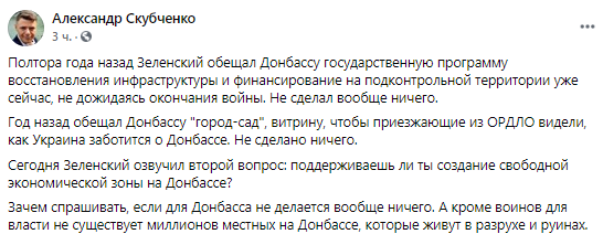 "Полтора года назад Зеленский обещал Донбассу государственную программу восстановления инфраструктуры и финансирование на подконтрольной территории уже сейчас, не дожидаясь окончания войны. Не сделал вообще ничего.