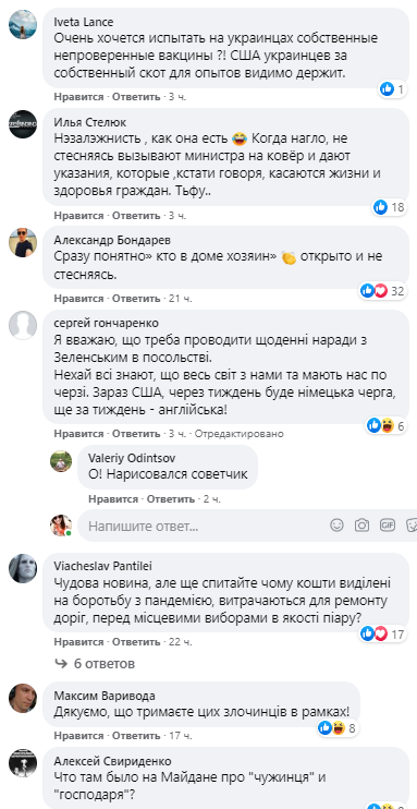 "Вчера временный поверенный в делах США Кристина Квин пригласила на конструктивный коллегиальный ужин министра Степанова, чтобы обсудить борьбу с COVID-19 и реформы сектора здравоохранения. Украина НЕ будет покупать российскую вакцину от COVID, которая не прошла клинических испытаний на безопасность!" – говорится в Facebook посольства.