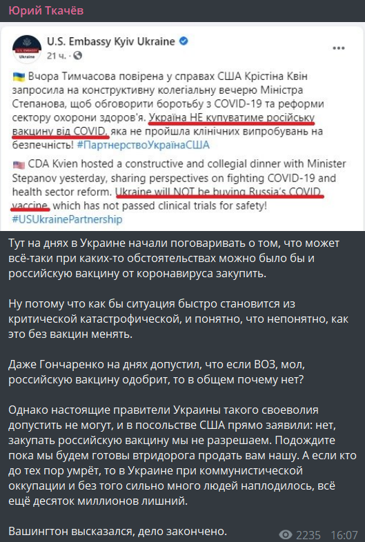 Вспомним, что сообщению американского посольства предшествовало заявление министра здравоохранения Степанова о том, что в случае прохождения всех стадий испытаний, Минздрав готов говорить о закупке любой вакцины, вне зависимости от страны-производителя. То есть, дал понять, что российскую вакцину, теоретически, Украина может взять.