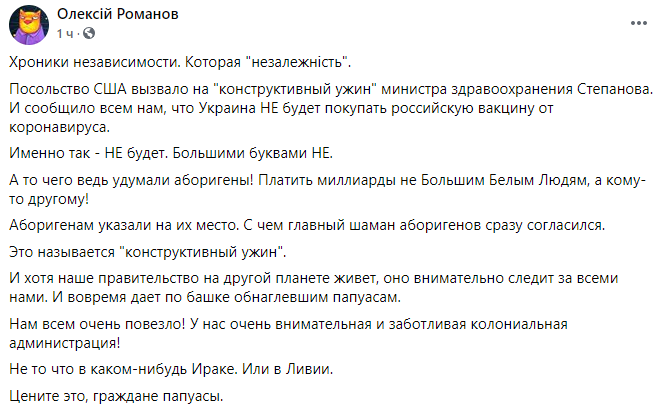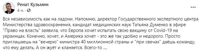 "Вся независимость как на ладони. Напомню, директор Государственного экспертного центра Министерства здравоохранения, кандидат медицинских наук Татьяна Думенко в эфире "Право на власть" заявила, что Европа хочет испытать свою вакцину от Сovid-19 на украинцах. Конечно, хочет, и Америка хочет – это же так удобно и недорого. Просто приглашаешь на "вечерю" министра 40-миллионной страны и "при свечах" даешь команду, что ему делать. А он жует и кланяется. Всего-то".