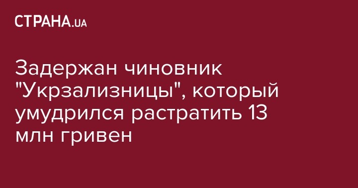 Национальное антикоррупционное бюро Украины (НАБУ) отчиталось о задержании бывшего сотрудника железнодорожной госкомпании, который завладел средствами филиала "Центр управления промышленностью" ПАО "Укрзализныця" на сумму 13,65 млн грн. Об этом сообщает пресс-служба НАБУ.